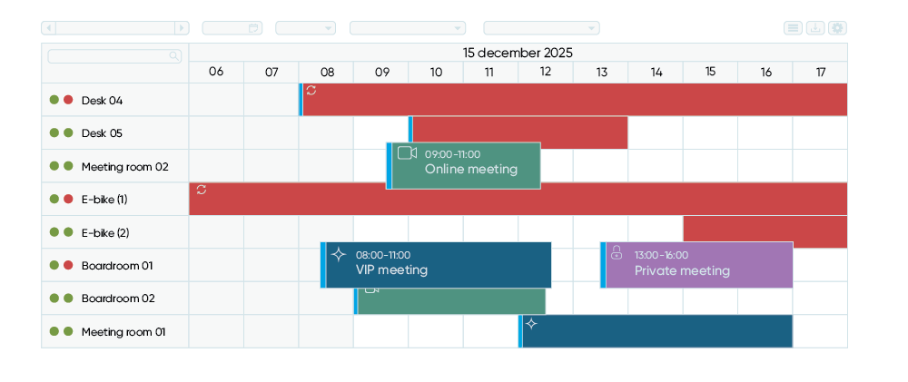 Custom colors allow you to control how reservations are displayed in the Reservations view in officeAdmin. By assigning a specific color to each reservation type, planners can quickly distinguish between different kinds of bookings—such as private reservations, VIP meetings, online meetings, booking requests, and regular reservations.